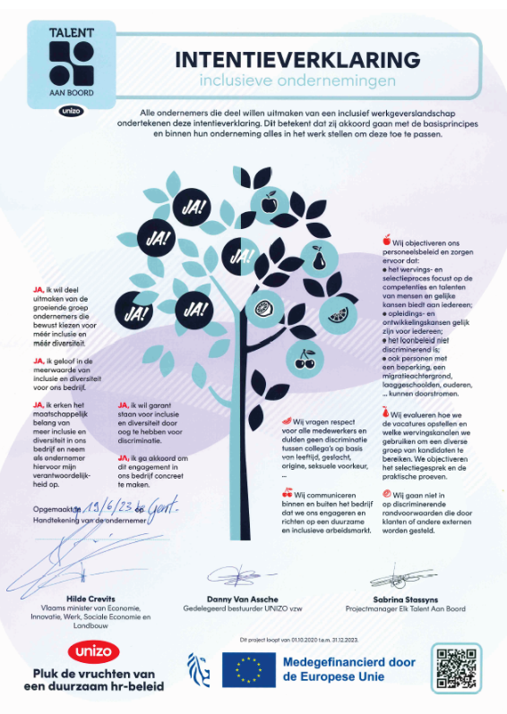 Wat al lange tijd centraal stond in onze bedrijfsvisie als werkgever, is nu expliciet vastgelegd. Door het ondertekenen van deze intentieverklaring bevestigt Agaris haar instemming met de principes van een inclusief bedrijf. Deze stap onderstreept onze inzet om alle basisprincipes verder te verankeren in onze dagelijkse bedrijfsvoering.