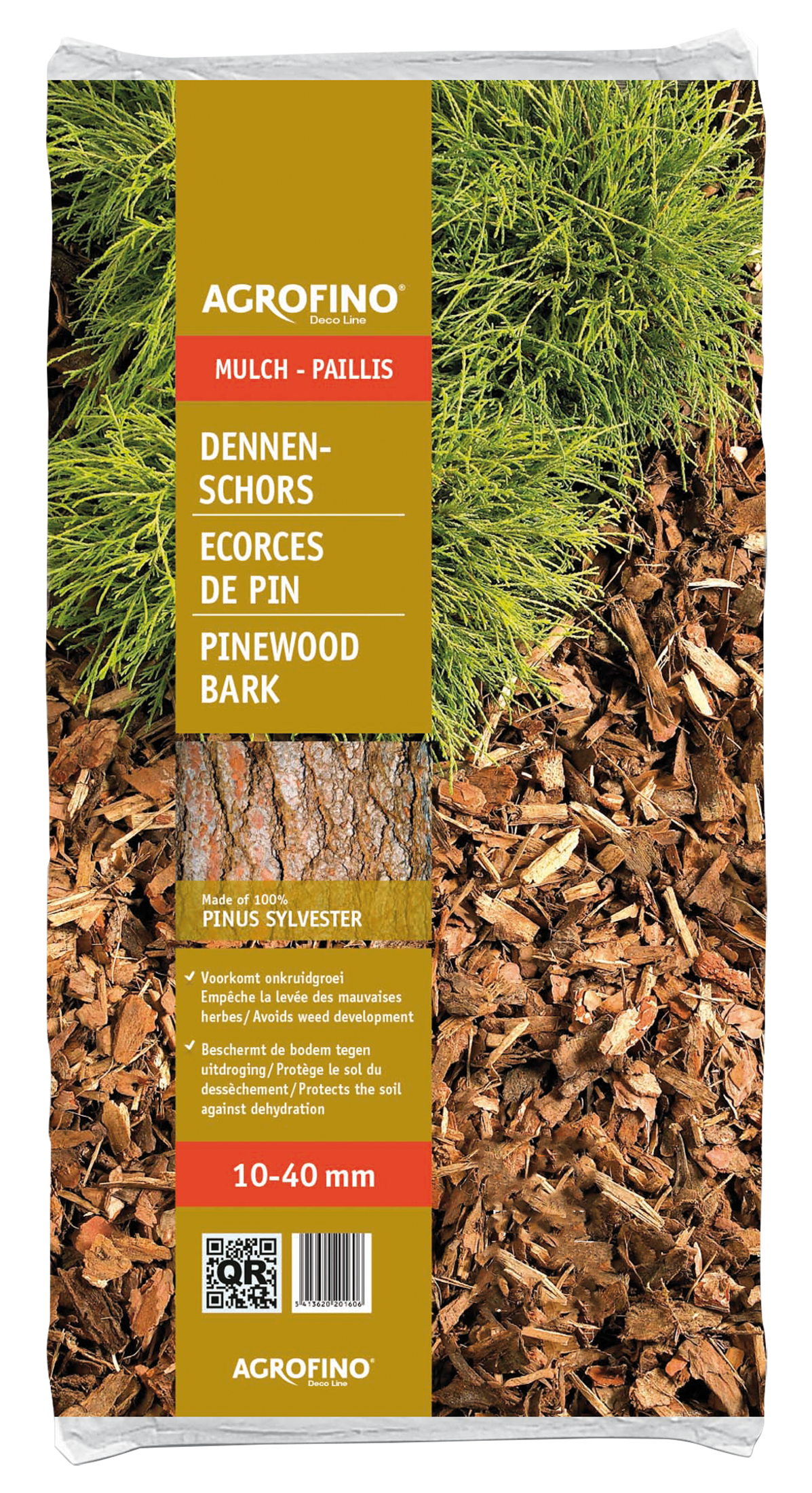 Dit is een decoratieve organische bodembedekker, vervaardigd uit schors van de Pinus sylvestris-boom. Deze decoratieve schors is een natuurlijk product en is afkomstig uit Europese bossen. De schors wordt gezeefd tot 10/40 mm om een product met een uniforme grootte te verkrijgen. Door de natuurlijke hardheid van de Pinus sylvestris-boom heeft dit product een verwachte levensduur van 2 tot 3 jaar. De naam Mulch verwijst naar het decoratieve karakter van het product, dat een bepaalde hoeveelheid houtvezels bevat.